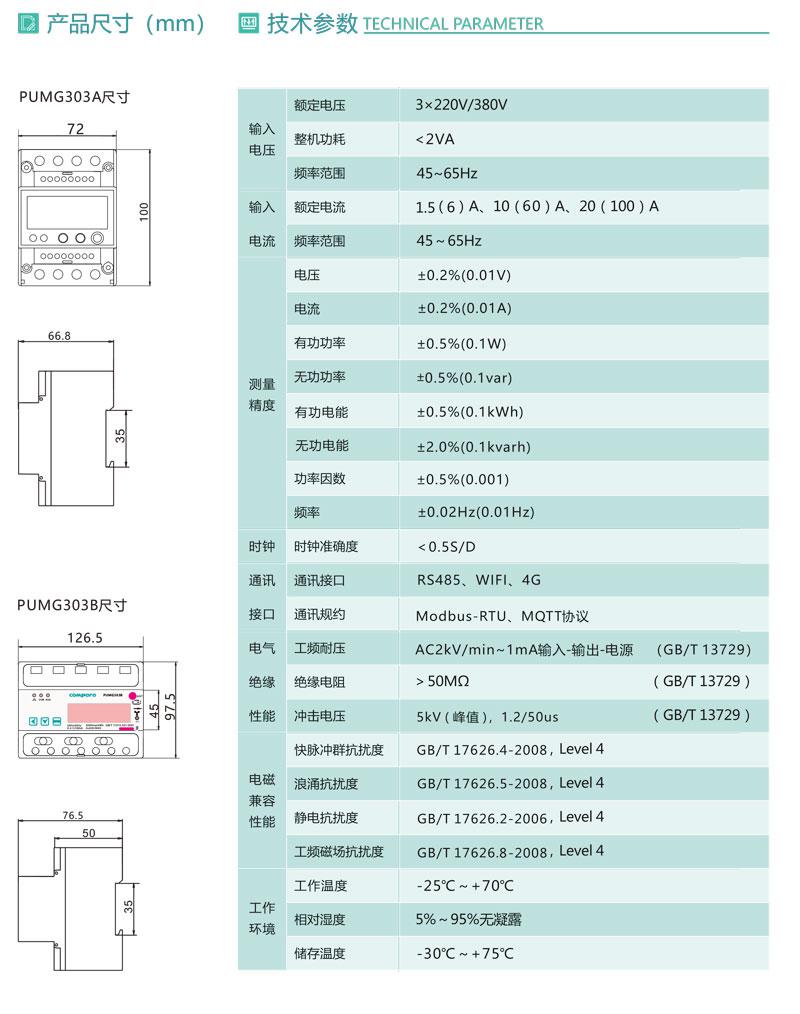 PUMG303三相導(dǎo)軌式智能電能表采用DIN35mm導(dǎo)軌式安裝結(jié)構(gòu)、LCD顯示,測量電能及其它電參量,可進(jìn)行時鐘、費率時段等參數(shù)設(shè)置,并具有電能脈沖輸出功能;可用RS485通訊接口與上位機實現(xiàn)數(shù)據(jù)交換。該電能表具有體積小巧、精度高、可靠性好、安裝方便等優(yōu)點,性能指標(biāo)符合國標(biāo)GB/T17215-2002、GB/T17883-199和電力行業(yè)標(biāo)準(zhǔn)DL/T614-2007對電能表的各項技術(shù)要求,適用于政府機關(guān)和大型公建中對電能的分項計量,也可用于企/事業(yè)單位作電能管理考核。