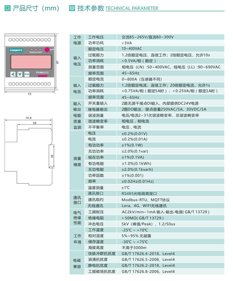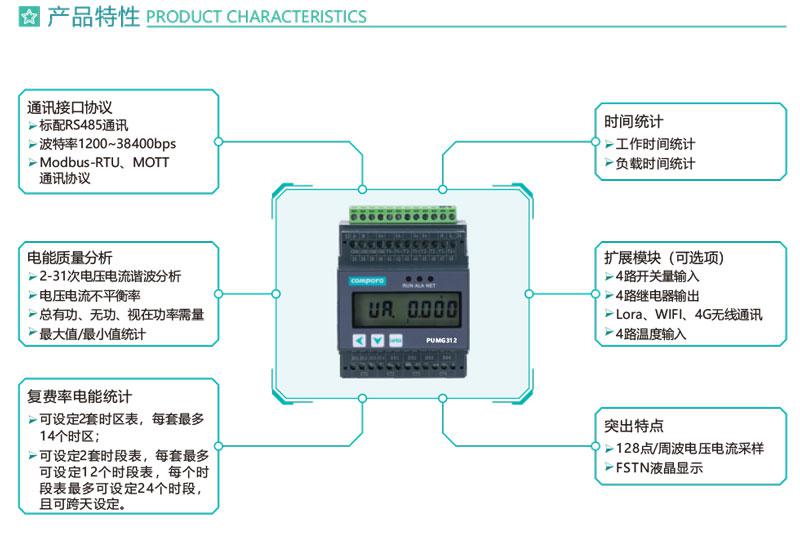 PUMG312系列三相導(dǎo)軌式智能電力能效終端采用DIN35mm 導(dǎo)軌式安裝結(jié)構(gòu)和LCD液晶屏顯示,可測4個(gè)三相回路的電參量、2~31次諧波、統(tǒng)計(jì)運(yùn)行時(shí)間等,標(biāo)配1路RS485通訊接口,可通過Modbus -RTU或MQTT通訊協(xié)議實(shí)現(xiàn)儀表的網(wǎng)絡(luò)化管理。還可擴(kuò)展4路開關(guān)量輸入和4路繼電器輸出,外接開口式互感器易于改造項(xiàng)目的施工。PUMG312具有體積小巧,精度高,可靠性好,安裝方便等優(yōu)點(diǎn),多用于系統(tǒng)集成.