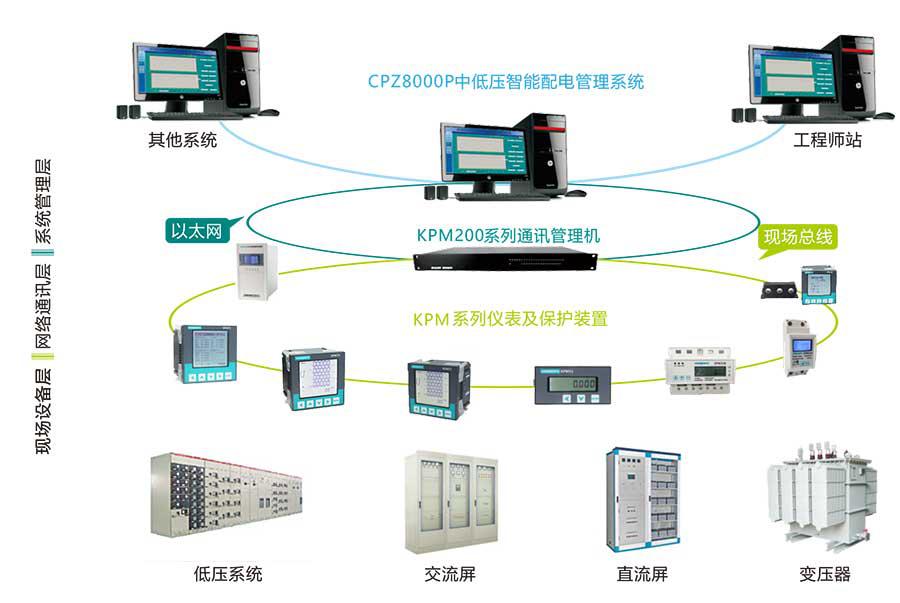CPZ8000P中低壓智能配電管理系統(tǒng)采用分層、分布式結(jié)構(gòu)設(shè)計(jì),按間隔單元?jiǎng)澐?、模塊化設(shè)計(jì),整個(gè)系統(tǒng)分為三層:系統(tǒng)管理層、網(wǎng)絡(luò)通訊層、現(xiàn)場設(shè)備層。