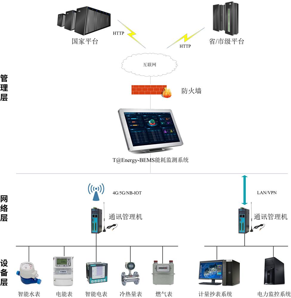 設(shè)備層:主要由電能表、水表、燃?xì)獗?、冷熱量、蒸汽表以及第三方監(jiān)測(cè)系統(tǒng)組成。