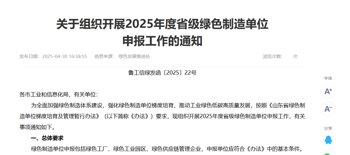 為全面加強(qiáng)綠色制造體系建設(shè),強(qiáng)化綠色制造單位梯度培育,推動(dòng)工業(yè)綠色低碳高質(zhì)量發(fā)展,按照《山東省綠色制造單位梯度培育及管理暫行辦法》(以下簡(jiǎn)稱(chēng)《辦法》)要求,現(xiàn)組織開(kāi)展2025年度山東省綠色工廠、綠色工業(yè)園區(qū)申報(bào)工作。
