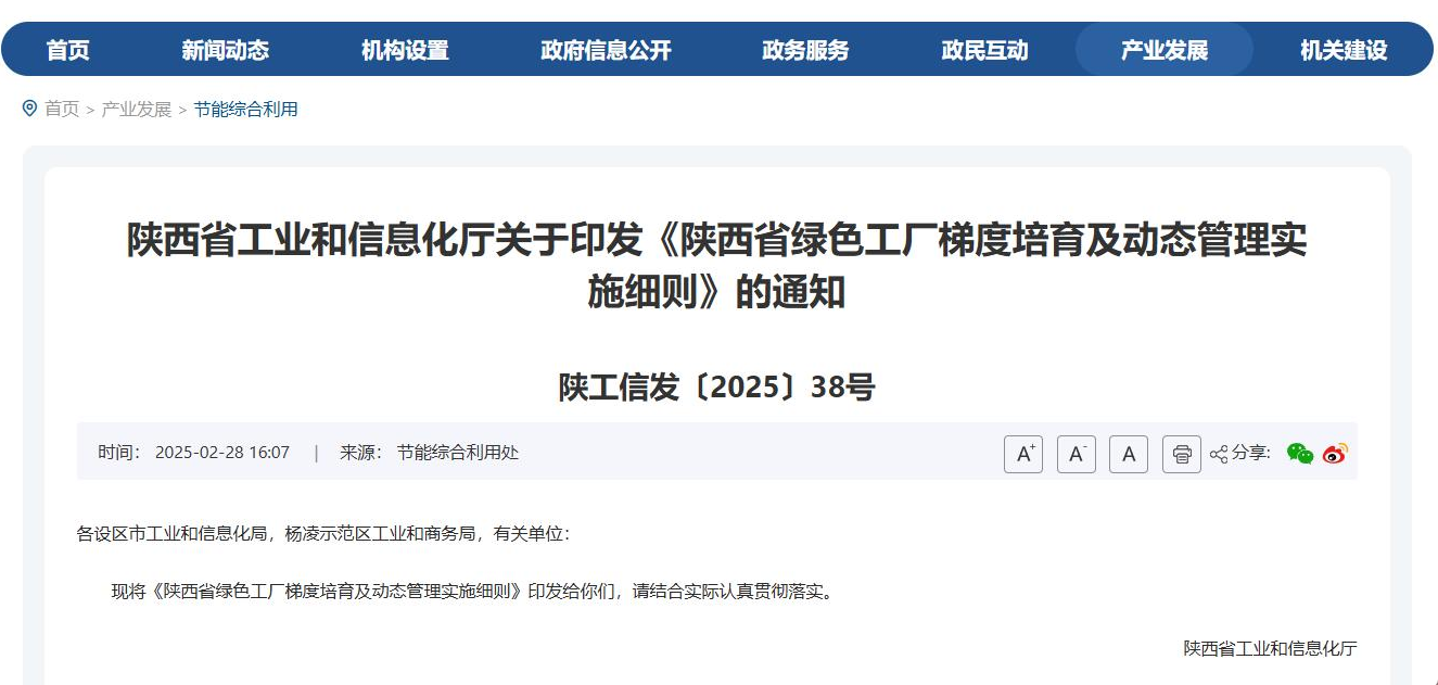為貫徹落實《陜西省綠色工廠梯度培育及動態(tài)管理實施細則》,加快形成規(guī)范化、長效化培育機制,推進工業(yè)綠色發(fā)展,助力工業(yè)領域碳達峰碳中和,現(xiàn)組織開展陜西省2025年綠色制造名單申報工作。