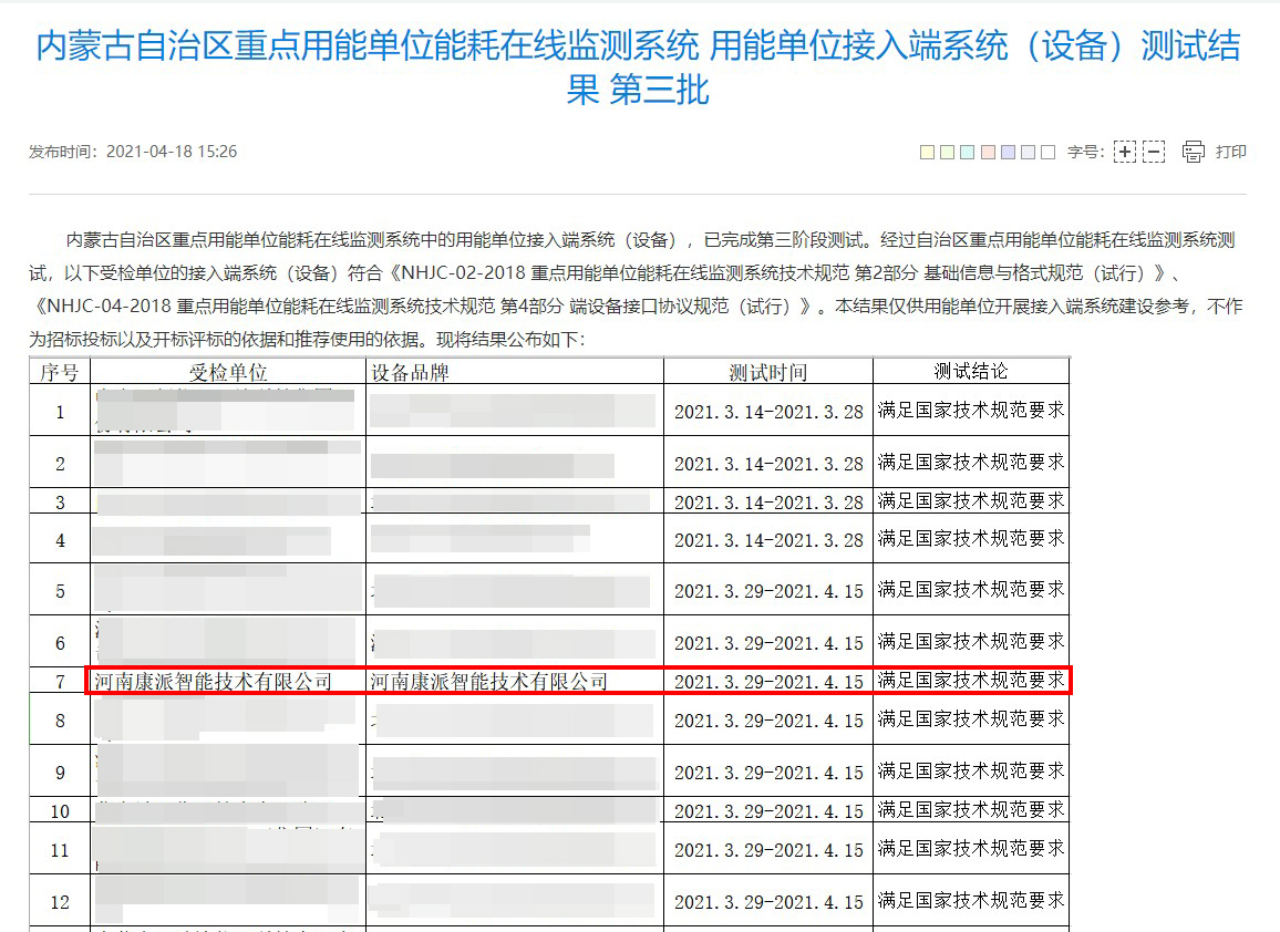 2021年4月18日,內(nèi)蒙古自治區(qū)重點(diǎn)用能單位能耗在線監(jiān)測系統(tǒng)中的用能單位接入端系統(tǒng)(設(shè)備),已通過第三階段測評。經(jīng)過內(nèi)蒙古自治區(qū)計量測試研究院測評,康派智能能耗在線監(jiān)測端設(shè)備符合內(nèi)蒙古自治區(qū)重點(diǎn)用能單位能耗在線監(jiān)測系統(tǒng)技術(shù)要求。公布結(jié)果如下圖所示: