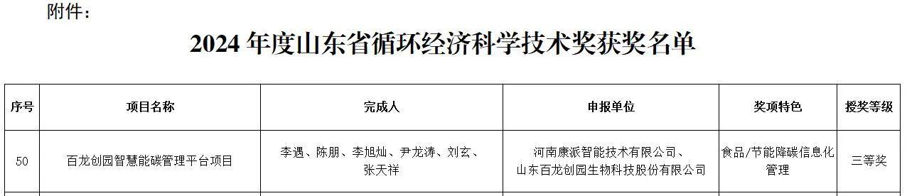 2024年12月18日,山東省循環(huán)經(jīng)濟(jì)協(xié)會組織的“2024年山東省循環(huán)經(jīng)濟(jì)科學(xué)技術(shù)獎”評審結(jié)果公布,由河南康派智能技術(shù)有限公司牽頭,山東百龍創(chuàng)園生物科技股份有限公司參與落地的《百龍創(chuàng)園智慧能碳管理平臺項目》榮獲“2024年度山東省循環(huán)經(jīng)濟(jì)科學(xué)技術(shù)獎”三等獎。
