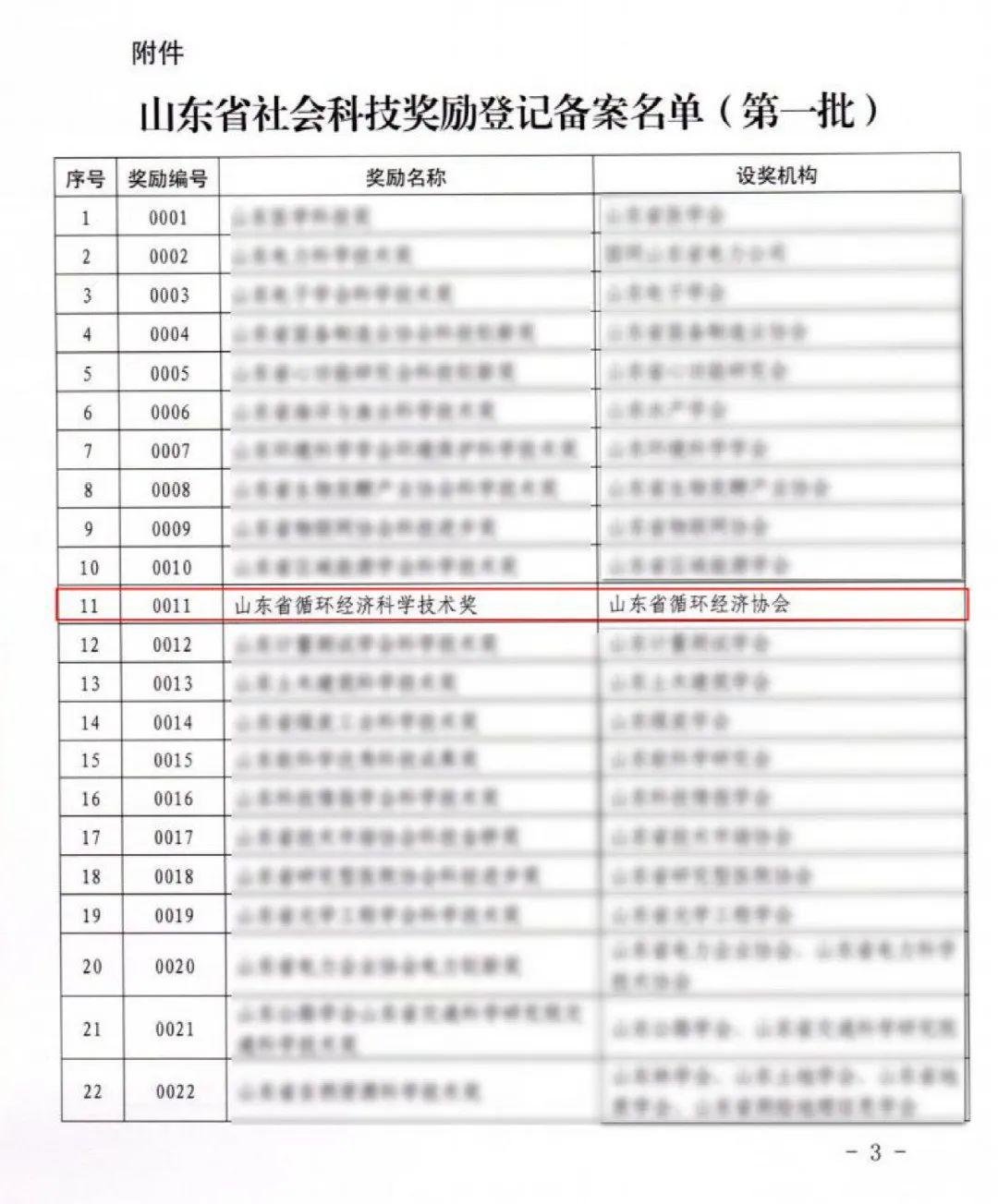 山東省循環(huán)經(jīng)濟(jì)科學(xué)技術(shù)獎是為深入貫徹《國務(wù)院辦公廳關(guān)于完善科技成果評價機(jī)制的指導(dǎo)意見》(國辦發(fā)〔2021〕26 號)精神,獎勵在山東省綠色低碳循環(huán)發(fā)展領(lǐng)域做出突出貢獻(xiàn)的單位和個人,按照《關(guān)于進(jìn)一步鼓勵和規(guī)范山東省社會力量設(shè)立科學(xué)技術(shù)獎的指導(dǎo)意見》(魯科字〔2018〕129 號)有關(guān)要求設(shè)立的獎項,該獎項列入山東省科學(xué)技術(shù)廳第一批山東省社會科技獎勵登記備案名單。